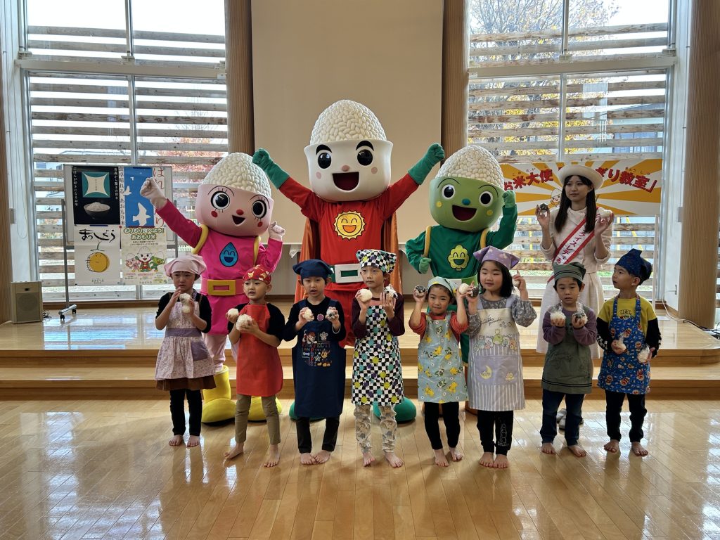 11月20日(金)、聖ヤコブ幼稚園(青森市)で、お米大使による「おにぎり教室」を開催しました。「お米大使ダンス」の音楽に合わせ、園児と先生のみなさんが歌いながら元気いっぱいに踊り、会場はとても明るく元気な雰囲気となりました。